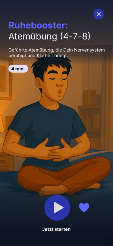 Die App bietet dir eine Bibliothek an geführten Audio-Übungen, die von Experten entwickelt wurden. Du hörst dir diese Übungen an – ähnlich wie bei einer Meditation oder einem Podcast. Dabei visualisierst du Prüfungssituationen, lernst Entspannungstechniken und stärkst dein positives Mindset. Es ist wie ein Fitnessstudio für deinen Kopf.